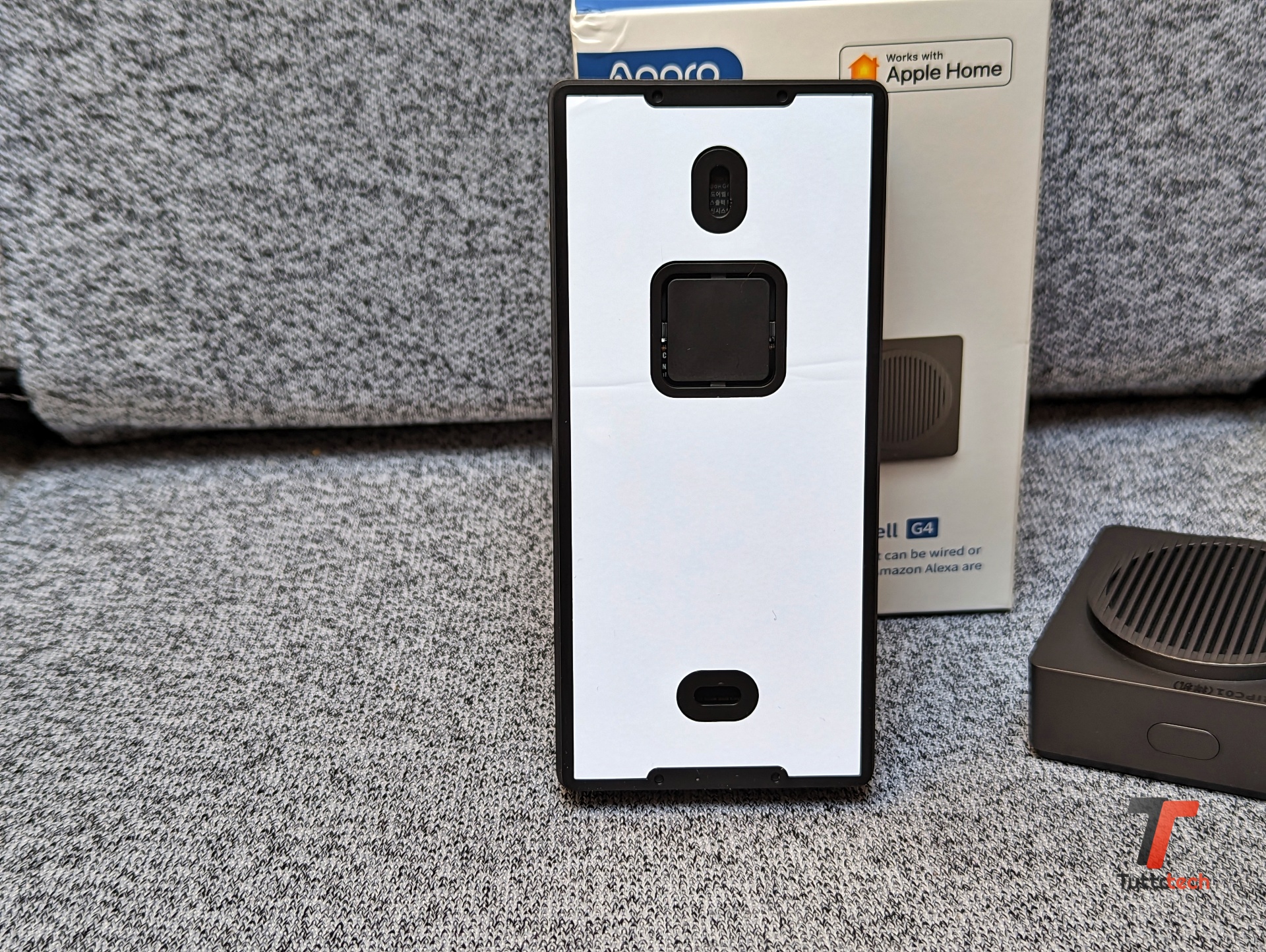 Il ripetitore, indispensabile per il funzionamento del sistema, si alimenta con un cavo USB Type-C e integra un piccolo speaker che simula il tradizionale suono del campanello (ma è possibile personalizzare la suoneria). Nella confezione di vendita trovate anche un piccolo cacciavite per aprire il campanello e un supporto inclinato, per semplificare il montaggio del campanello a muro. Sul retro del campanello è presente del biadesivo che semplifica il fissaggio su una porta o comunque su una superficie liscia.