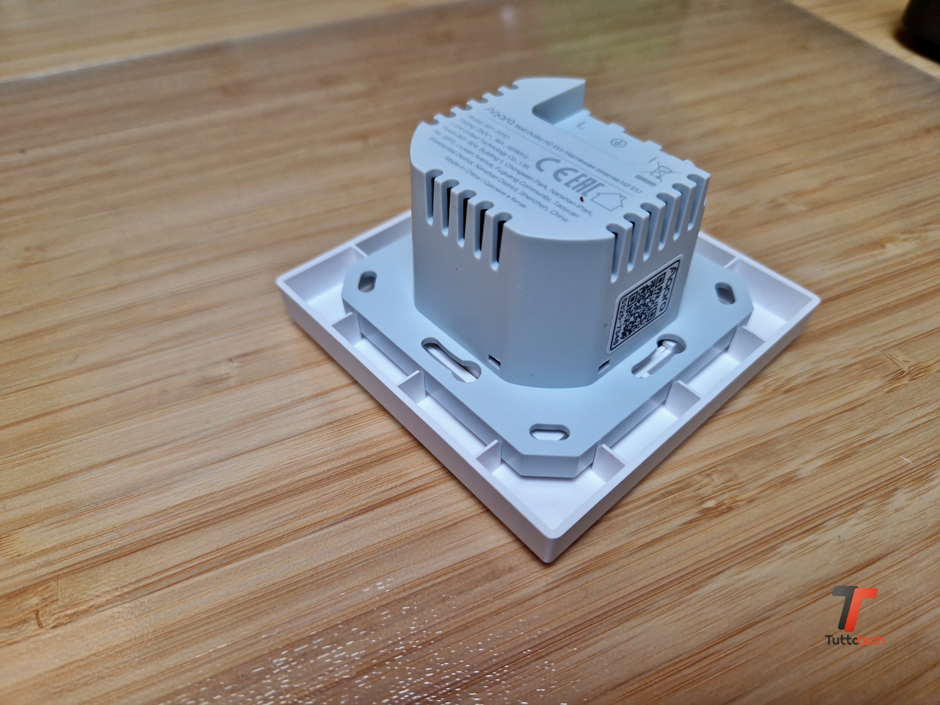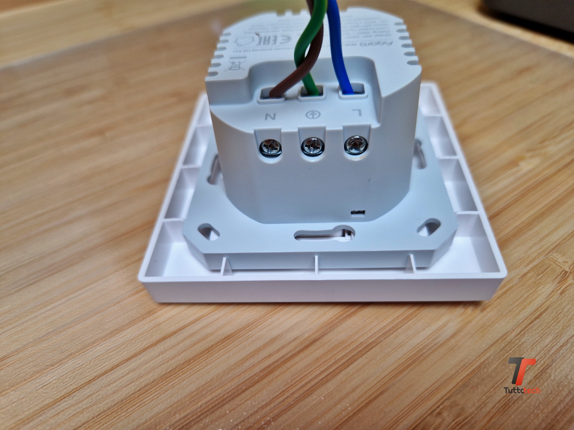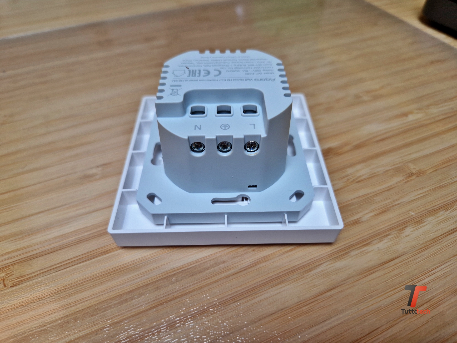 Utilizza il protocollo Zigbee, per questo è richiesto l’utilizzo di un hub per inserirlo nel proprio sistema di domotica. Nella parte frontale è presente un piccolo LED di stato e il pulsantino per avviare la procedura di pairing con l’hub. Sul retro invece è presente la parte elettronica con una morsettiera standard a tre contatti, con fase, neutro e messa a terra.