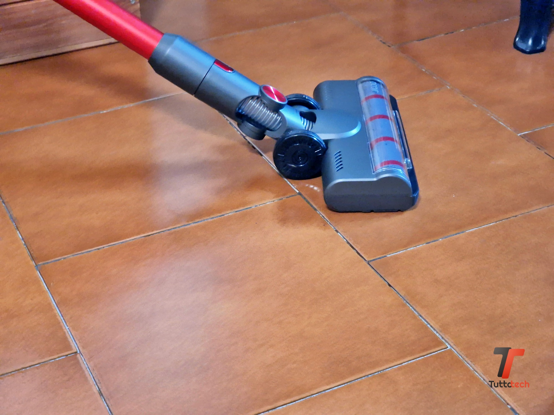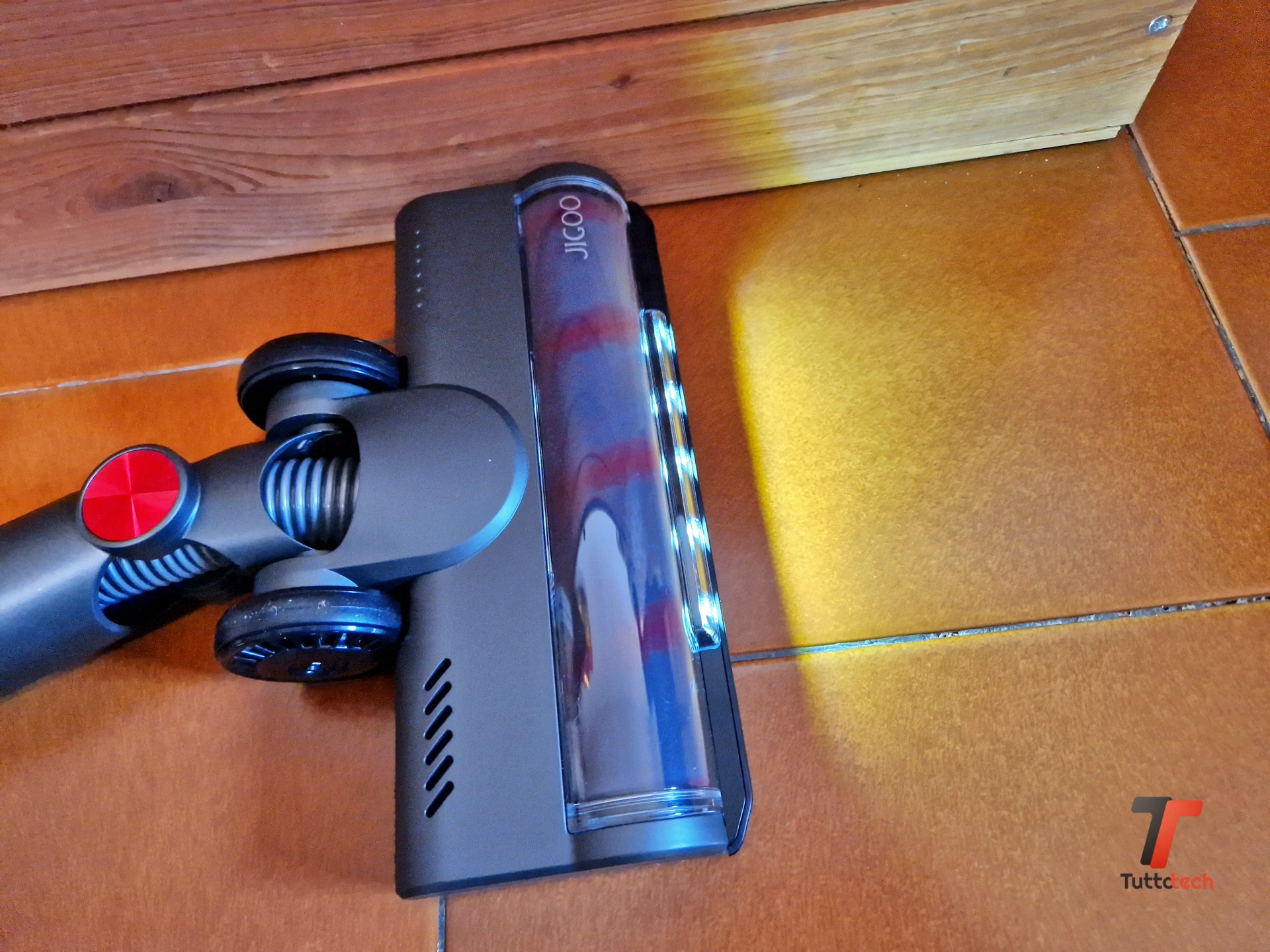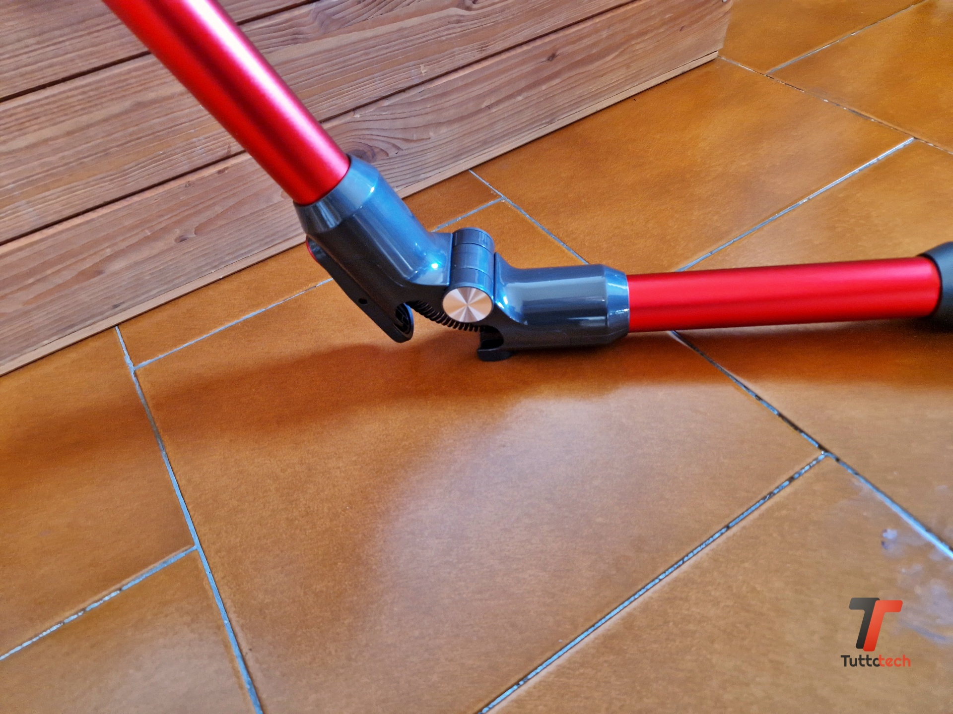 Per il resto abbiamo una spazzola motorizzata principale con LED frontali in grado di illuminare gli angoli per snidare anche lo sporco più nascosto, con un design a “V” pensato per ridurre la possibilità di aggrovigliamento di peli e capelli. Decisamente ottima la flessibilità, visto che è possibile tenere l’aspirapolvere completamente piano per arrivare anche sotto ai mobili più difficili, senza alcuna difficoltà. Lo snodo laterale consente inoltre di raggiungere un angolo di 180m gradi, così da pulire comodamente anche gli angoli e i passaggi più stretti presenti in casa.