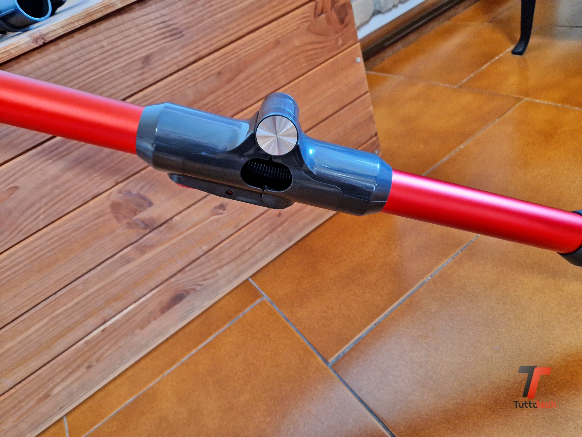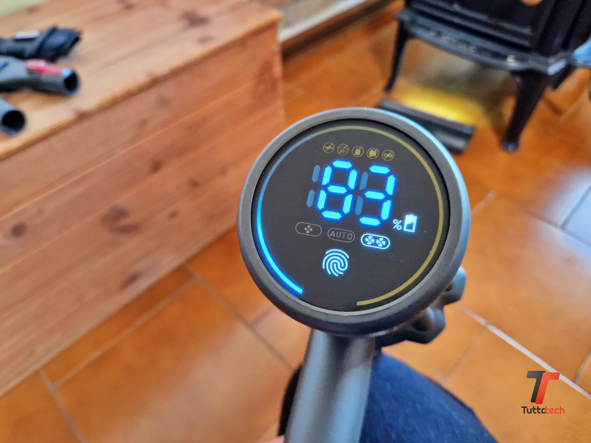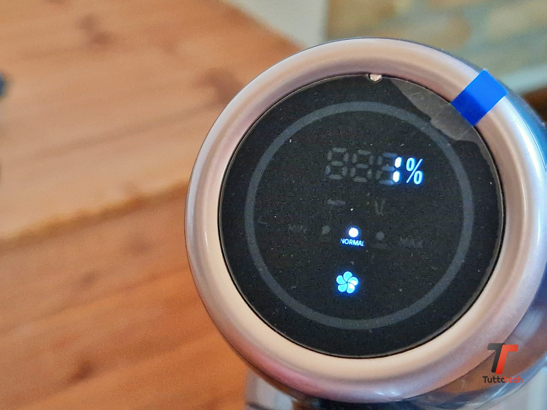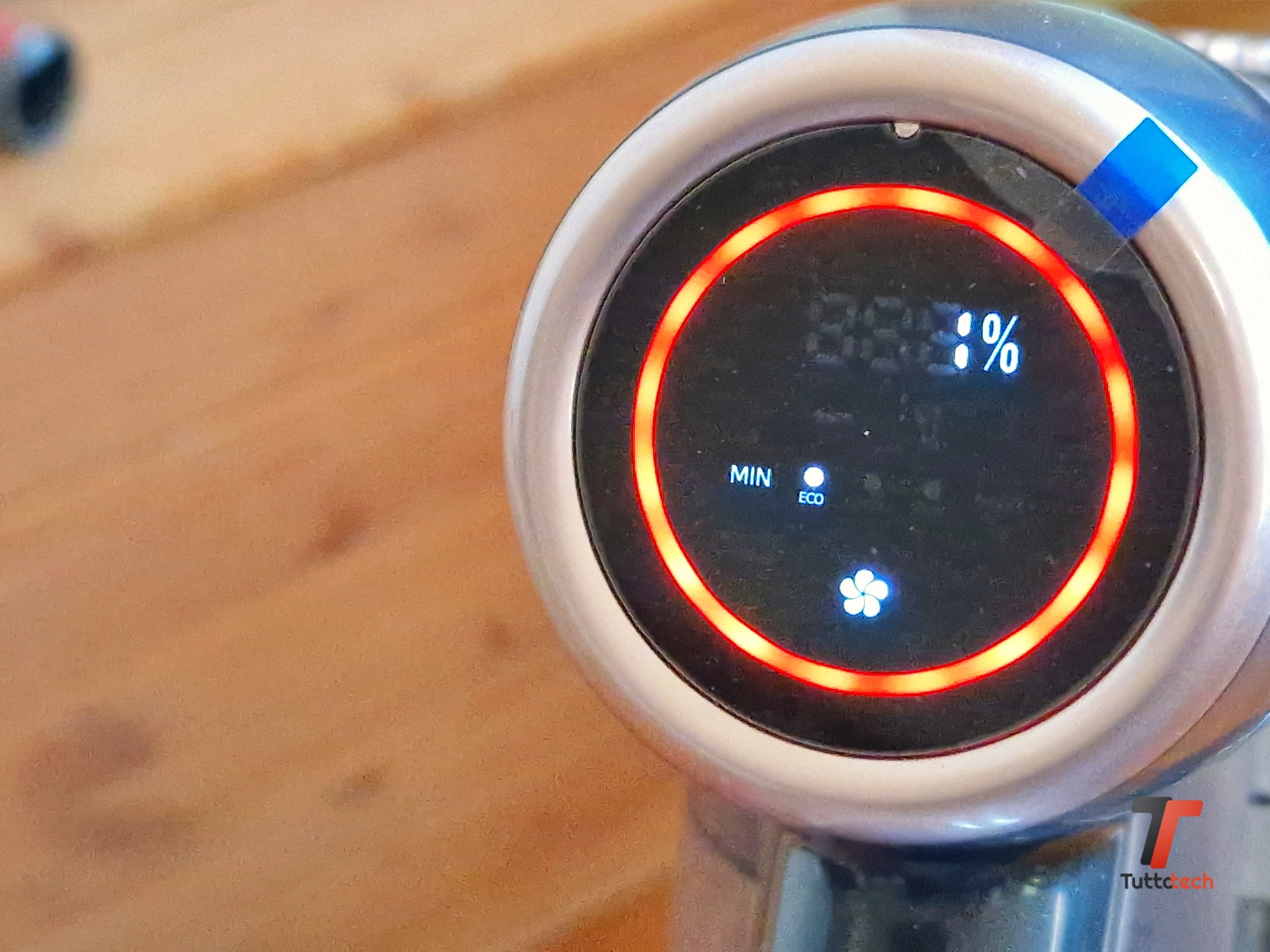 Abbiamo apprezzato anche lo schermo, posto dietro al motore, molto comodo da vedere in ogni situazione, con tutte le informazioni necessarie (autonomia residua e livello di potenza) e il tasto a sfioramento per cambiare la potenza di aspirazione. Non servono quindi particolari contorsioni per leggere il livello della batteria o per verificare eventuali problemi, una soluzione che ci è decisamente piaciuta.