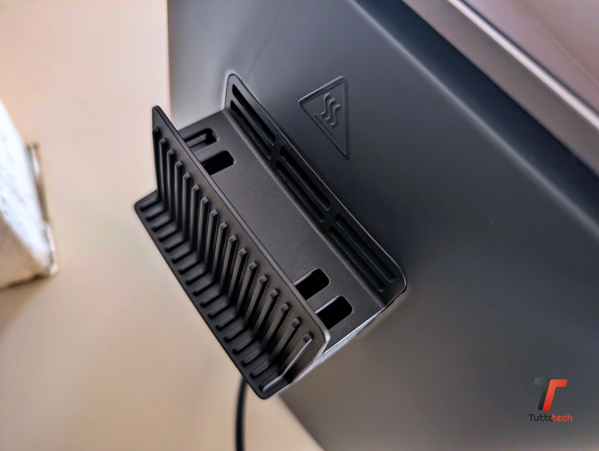 L’attenzione per i dettagli è evidente, basta guardare il retro della friggitrice: nella maggior parte dei modelli lo sfiato dell’aria calda avviene direttamente verso il retro, finendo nella migliore delle ipotesi sul paraschizzi, mentre COSORI ha utilizzato un sistema che devia l’aria calda verso l’alto, facilitando l’aerazione e lo sfiato.