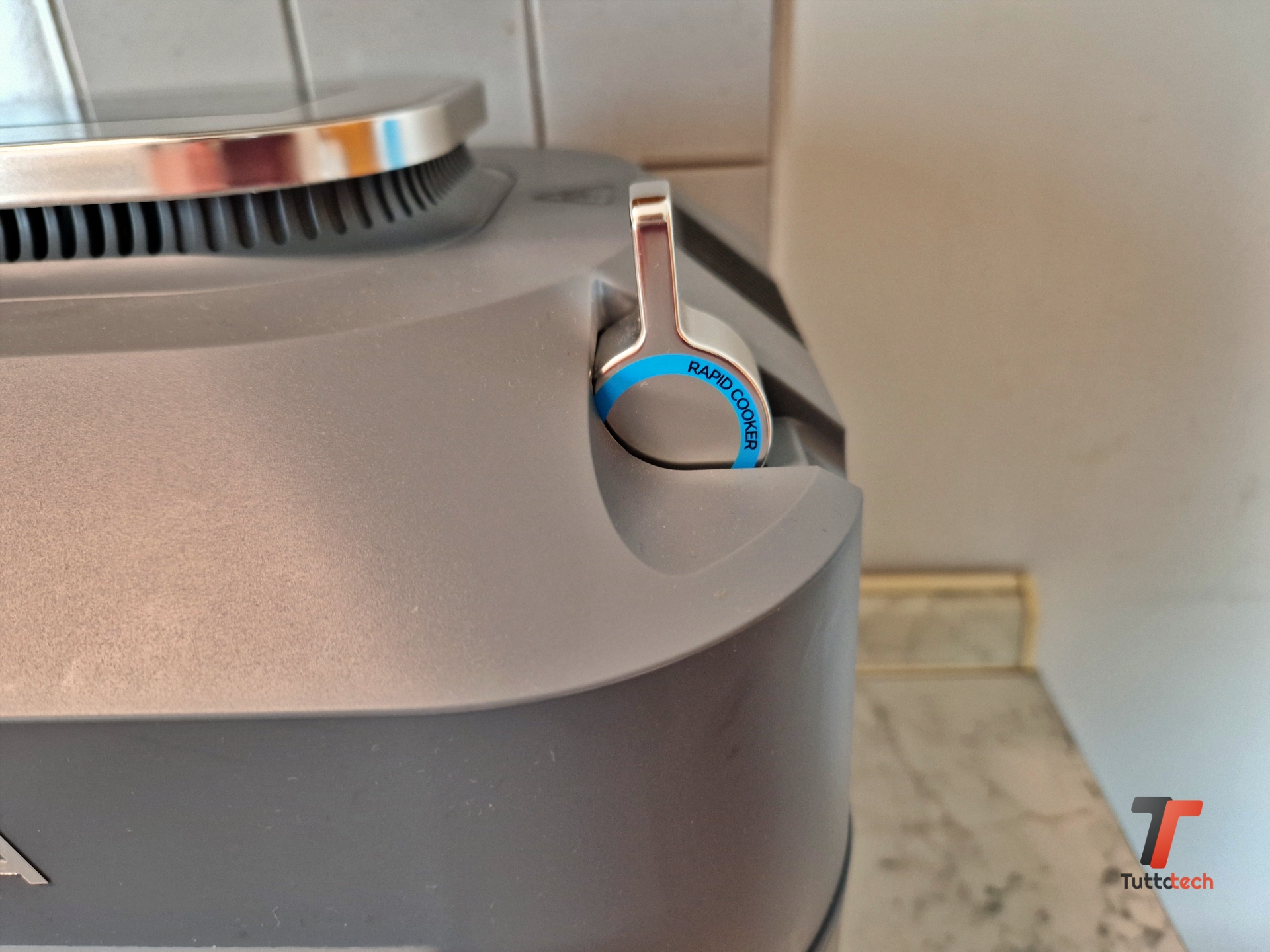 Il pannello frontale integra i controlli necessari al funzionamento del dispositivo. Oltre alla leva per passare dal rapid cooker alla friggitrice ad aria, sono presenti un piccolo display a cristalli liquidi, un tasto di accensione, uno di avvio/spegnimento e quattro pulsanti per regolare timer e temperatura.