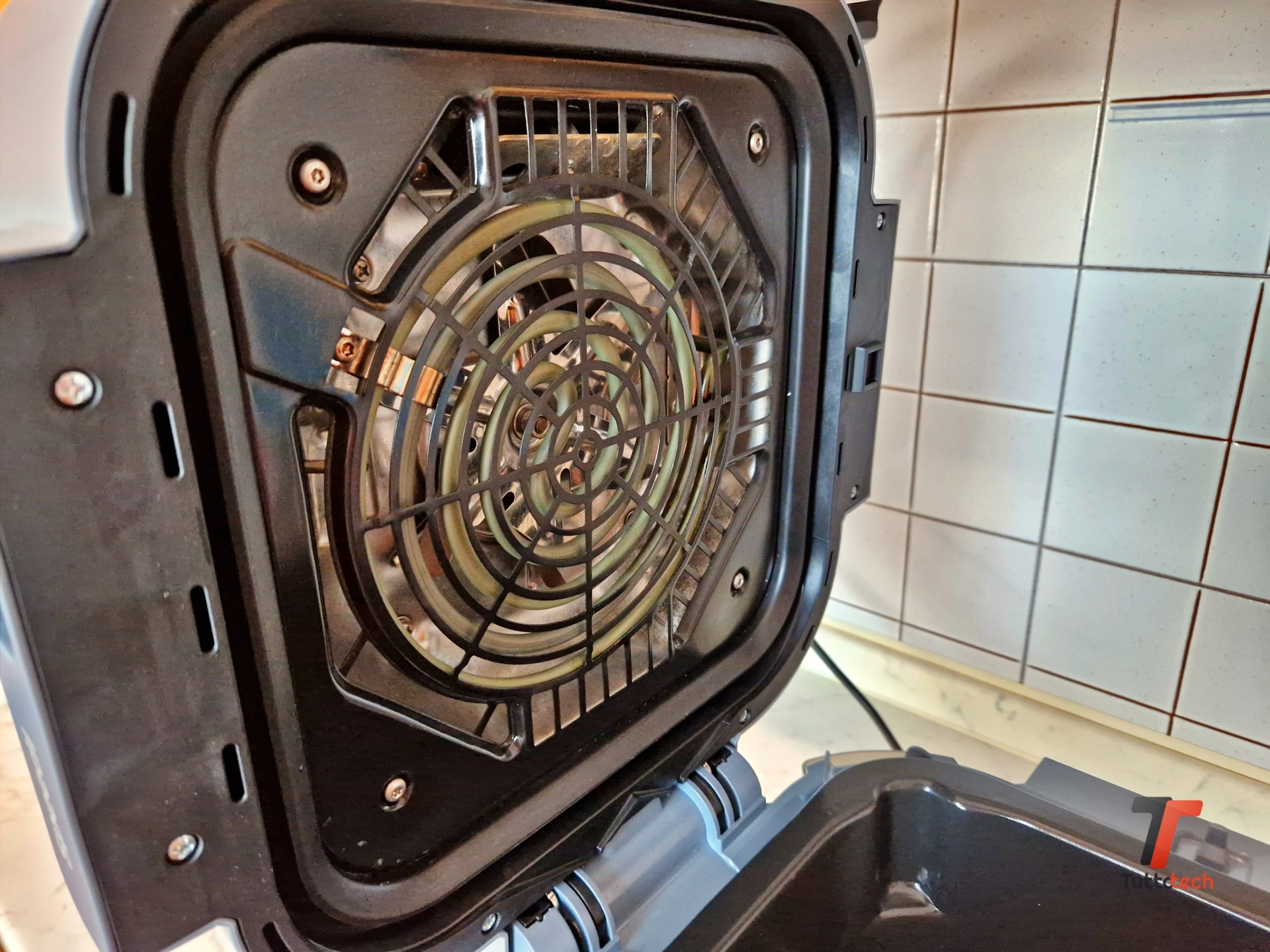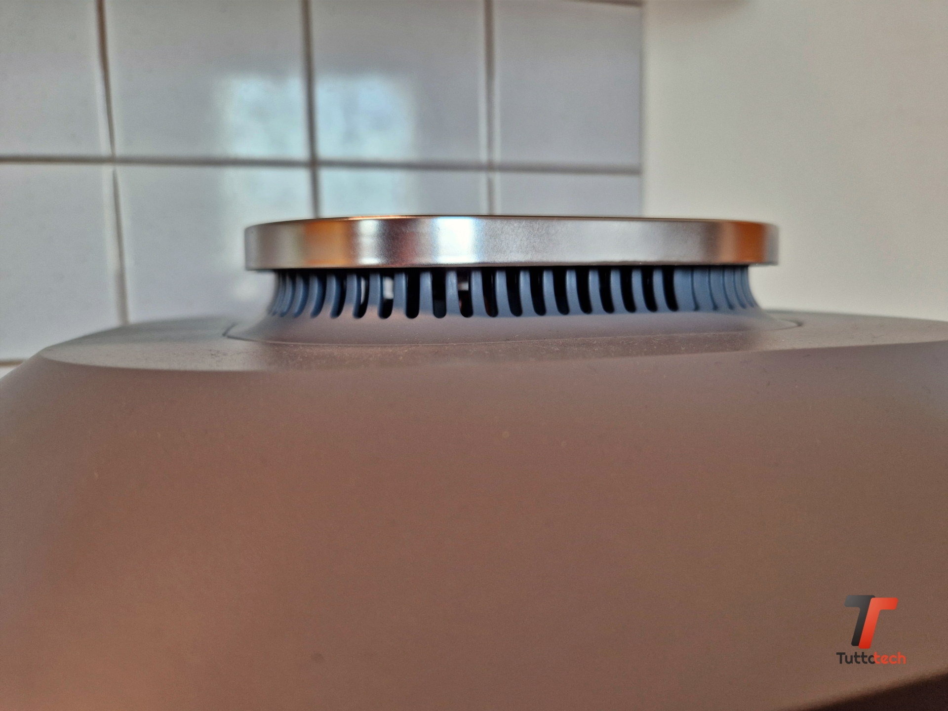 Nella parte superiore del coperchio è presente una griglia circolare dalla quale esce una discreta quantità di vapore, soprattutto utilizzando la funzione di frittura ad aria con vapore. Per questo è consigliabile assicurarsi che lo spazio attorno e sopra alla friggitrice sia libero: niente posizionamento all’interno di mobili o sotto ai pensili, per evitare di doverli pulire dal vapore e da eventuali residui di grasso.