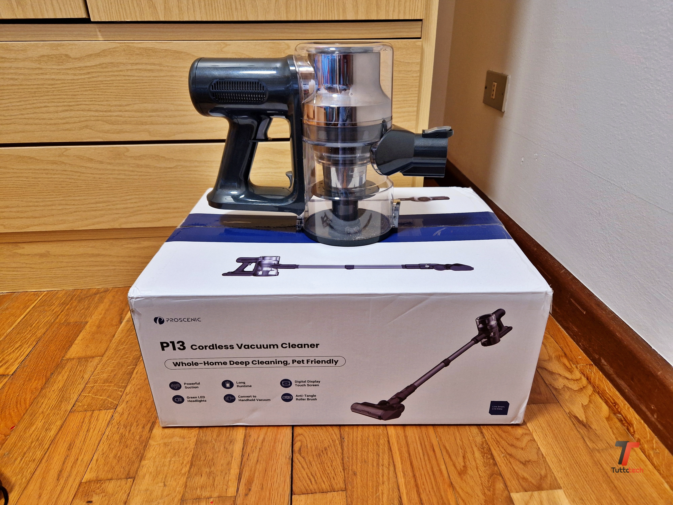 Sopra al corpo motore è presente uno schermo LED che mostra una serie di informazioni utili, come la potenza di aspirazione, l’autonomia residua, un avviso quando il contenitore dello sporco è pieno ed eventuali inceppamenti della spazzola motorizzata. Il filtro e tutti gli accessori possono tranquillamente essere lavati con acqua, rendendo molto semplice la manutenzione di questo Proscenic P13.