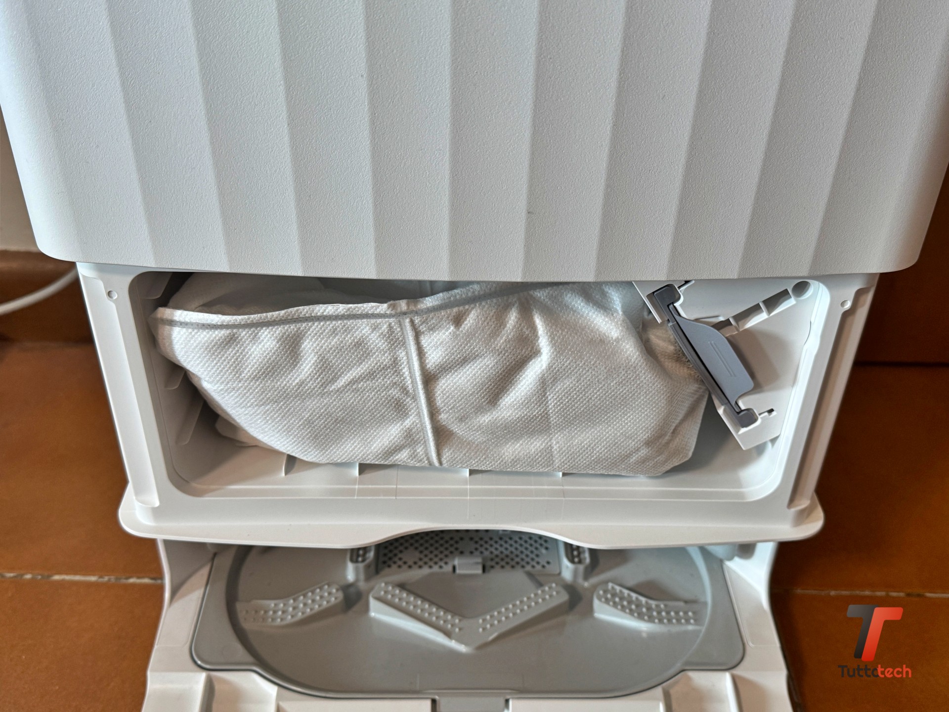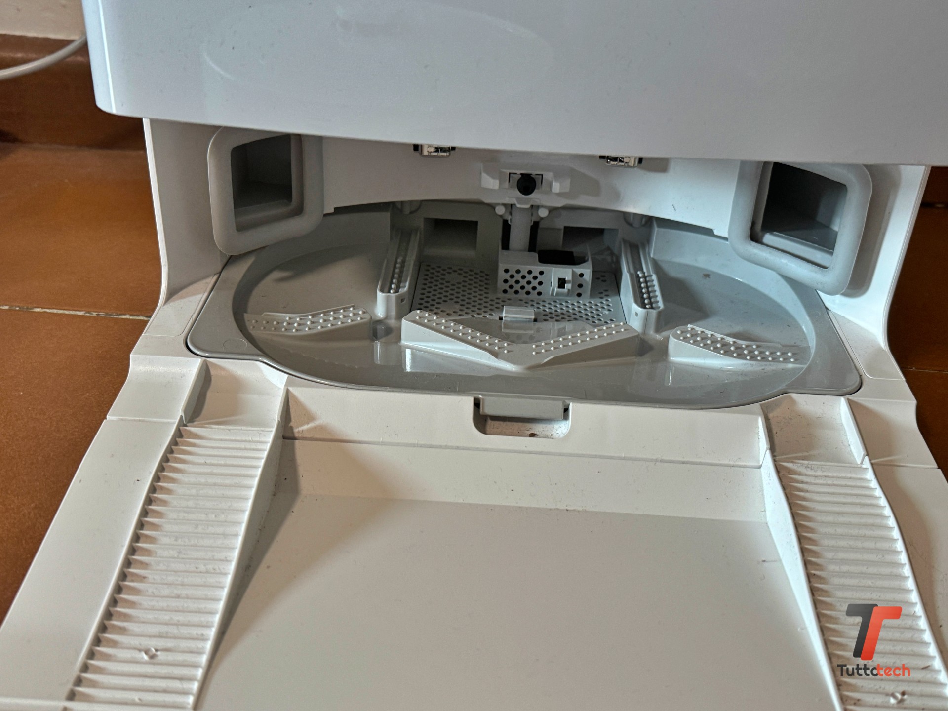 La stazione di ricarica è decisamente di qualità, e al netto della sola assenza del serbatoio per il detergente (ma potete tranquillamente aggiungerlo all’acqua pulita) non ha alcuna mancanza. Il lavaggio avviene in tre fasi e richiede davvero pochi minuti, peccato solo che non venga scaldata l’acqua. Questo significa che a intervalli regolari dovrete rimuovere i panni e lavarli a mano con detergente delicato e acqua calda, così da rimuovere a fondo eventuali residui di sporco e grasso (anche se nel nostro caso abbiamo trovato davvero poca roba).