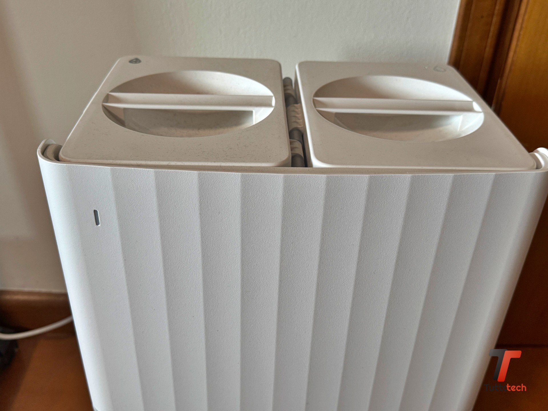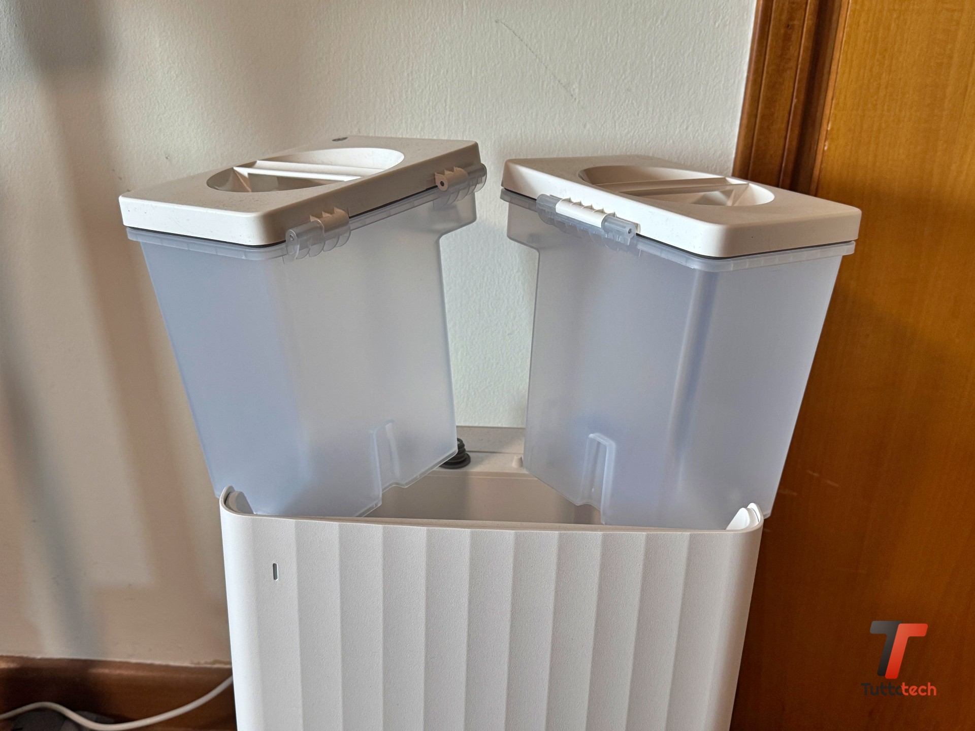 La stazione di ricarica è realizzata con una plastica, completamente bianca nel nostro caso, di ottima qualità, solida e senza scricchiolii. I due contenitori per l’acqua pulita (4 litri) e per quella sporca (3,5 litri) sono posizionati nella parte altra, senza un coperchio che li nasconda. Una scelta che premia la comodità, visto che è più semplice rimuoverli per riempirli o vuotarli, anche se col tempo finiranno per riempirsi di polvere che andrà rimossa, soprattutto sotto la maniglia per trasportarli.
