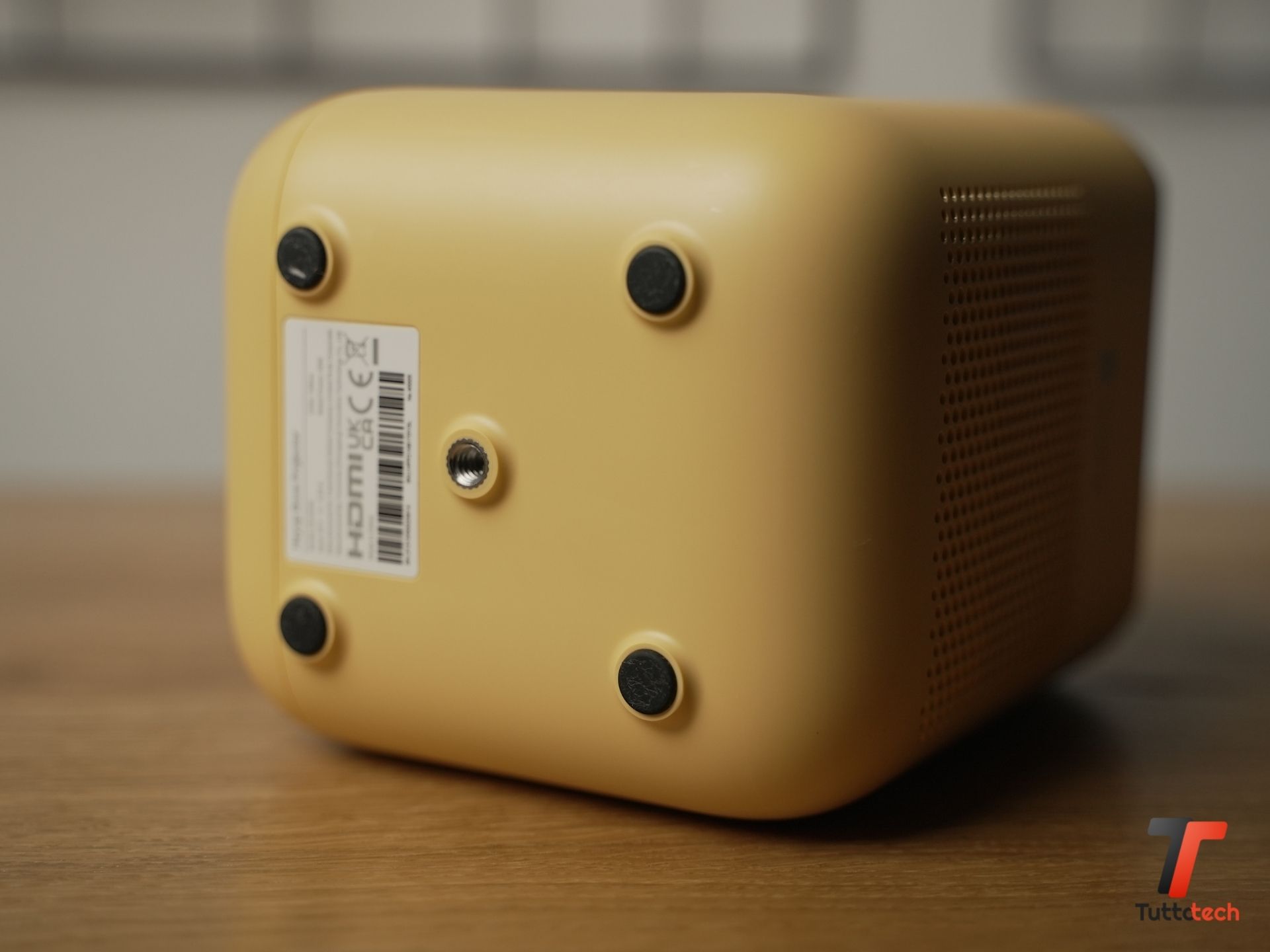 Lateralmente, da entrambi i lati, sono presenti gli speaker da 3W che potranno essere sfruttati anche come semplice cassa bluetooth qualora non volessimo proiettare alcun video. Nella parte inferiore, oltre ai piedini per poggiarlo, è presente una filettatura per utilizzarlo su un treppiedi, molto comodo se vogliamo usarlo per situazioni meno programmate.