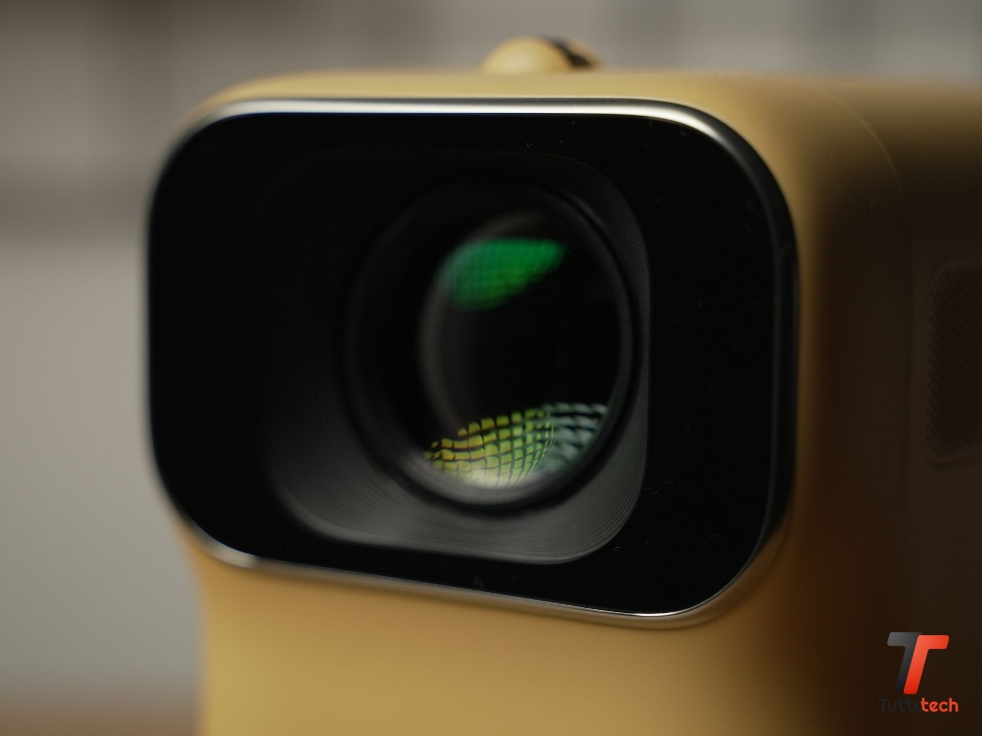 Sulla parte frontale troviamo la lente necessaria alla proiezione, la cui messa a fuoco può essere gestita tramite la rotella presente superiormente. C’è da dire che la distanza minima da un muro bianco o da un telo apposito deve essere di circa 2 metri, altrimenti l’immagine risulterà sfocata non permettendoci di visualizzare alcunché. Si tratta di un sistema di proiezione di tipo LCD con risoluzione nativa 1920 x 1080, ma in grado di riprodurre filmati fino a 4K.