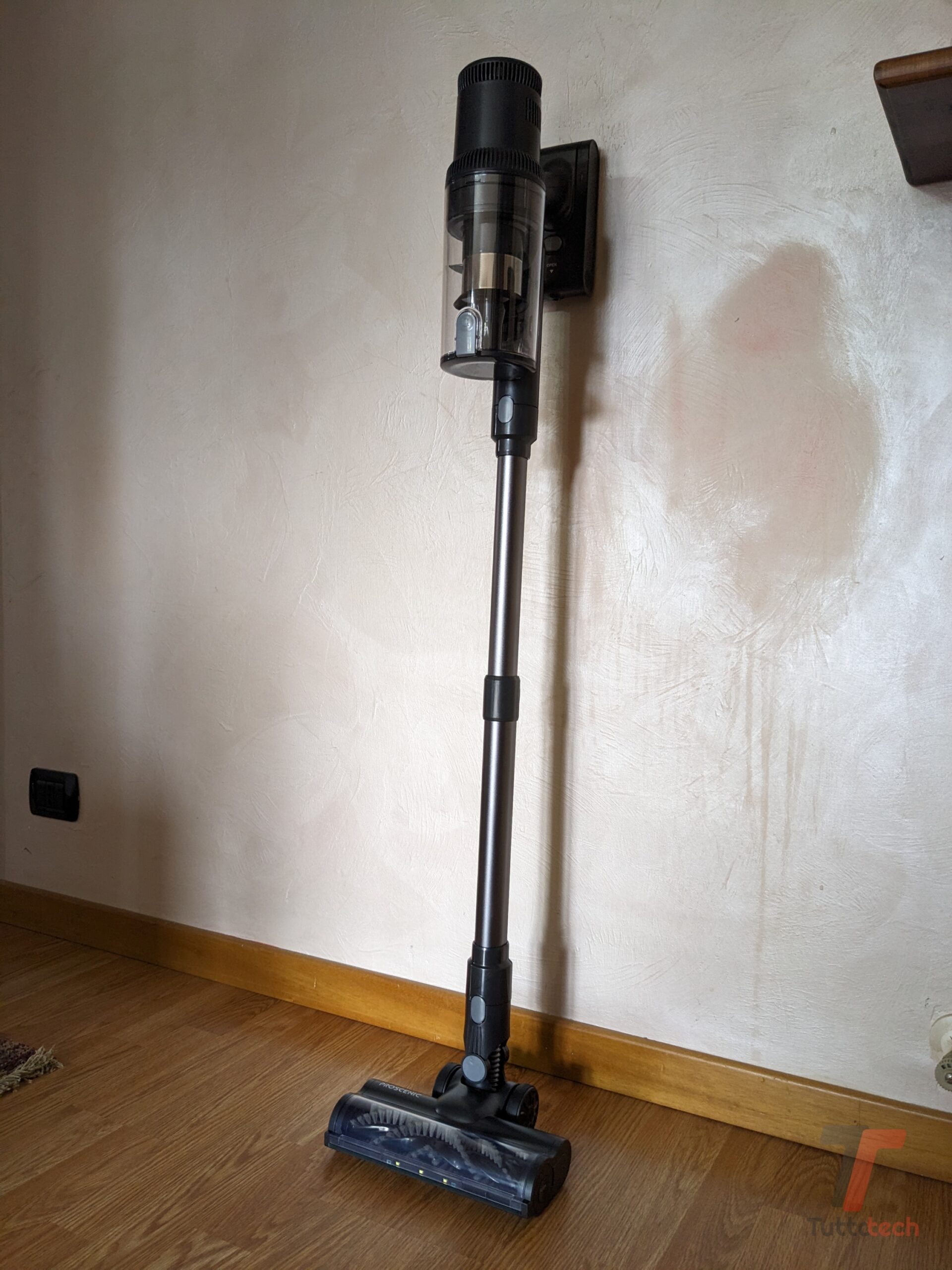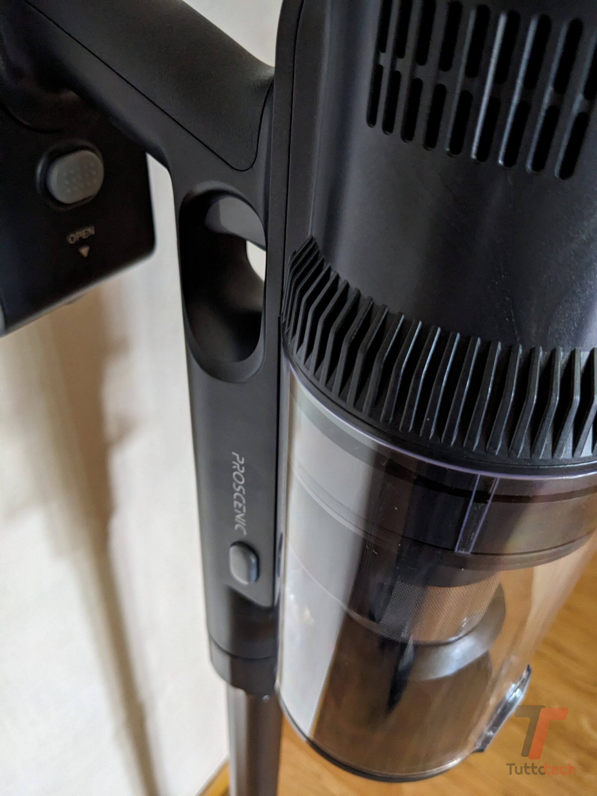 Dopo tutto questo e una volta avuta davanti la scopa montata, la cosa che ha colpito è stata la robustezza e la qualità con cui tutti i pezzi erano incastrati fra loro: infatti, la plastica di cui è realizzata è di buona qualità, i pezzi sono ben fatti e poi l’assemblaggio è preciso al punto giusto, tanto che una volta messi insieme tutti i pezzi la scopa risulta abbastanza solida e un sol blocco. Da questo punto di vista, un bel plauso a Proscenic perché è riuscita a realizzare un prodotto tutto sommato di buona qualità, per di più compatto e leggero, pur contenendone i costi.