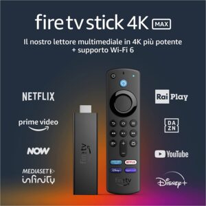 Amazon Fire TV Stick 4K Max è il dongle TV più pregiato dell’azienda, la cui seconda e più recente generazione è arrivata in Italia a ottobre 2023. Si tratta del dispositivo più completo per chi cerca uno streaming video senza rinunce grazie a un processore quad core più potente, la riproduzione video in 4K a 60 fps, 16 GB di spazio di archiviazione, 2 GB di memoria, Wi-Fi 6E, supporto dei formati Dolby Vision, HDR e HDR10+, oltre all’audio spaziale Dolby Atmos. Nuova anche la modalità ambiente che rende la TV una sorta di display intelligente e il telecomando vocale Alexa Enhanced Edition, con pulsanti dedicati ai canali e un tasto “Recenti” per accedere rapidamente all’ultima app o al canale usato.