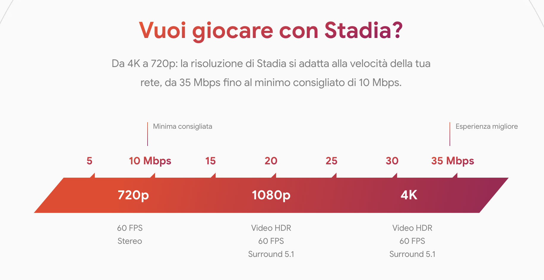 Google Stadia permette di accedere ai giochi a diverse risoluzione in base alla velocità di connessione internet. La banda consigliata da Google per usufruire del servizio prevede i seguenti tagli: