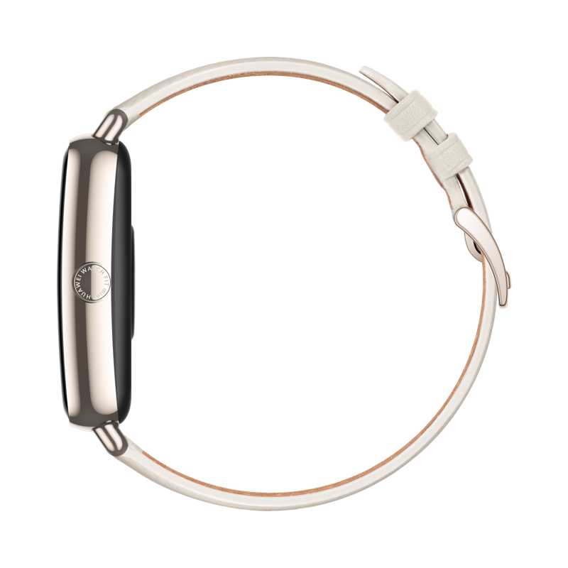 Lo smartwatch è più compatto del modello normale e ha un peso di 20 grammi, cinturino escluso: le dimensioni sono di 51,52 x 25,91 x 11,04 mm. La colorazione della cassa in alluminio è una sola, Light Gold, ma è possibile scegliere tra tre tipologie di cinturini: due in pelle, Frosty White e Mocha Brown, e uno in fluoroelastometro (Taro Purple).