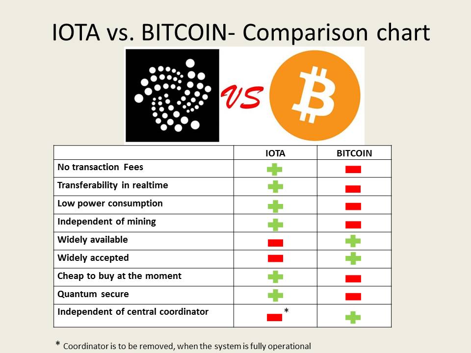 Tutti questi concetti sono totalmente opposti al principio di Bitcoin. Non esistono reali svantaggi di IOTA nei confronti del Bitcoin, se non forse che il valore non è paragonabile vista l'estrema popolarità del Bitcoin e che non è ampiamente accettato online.