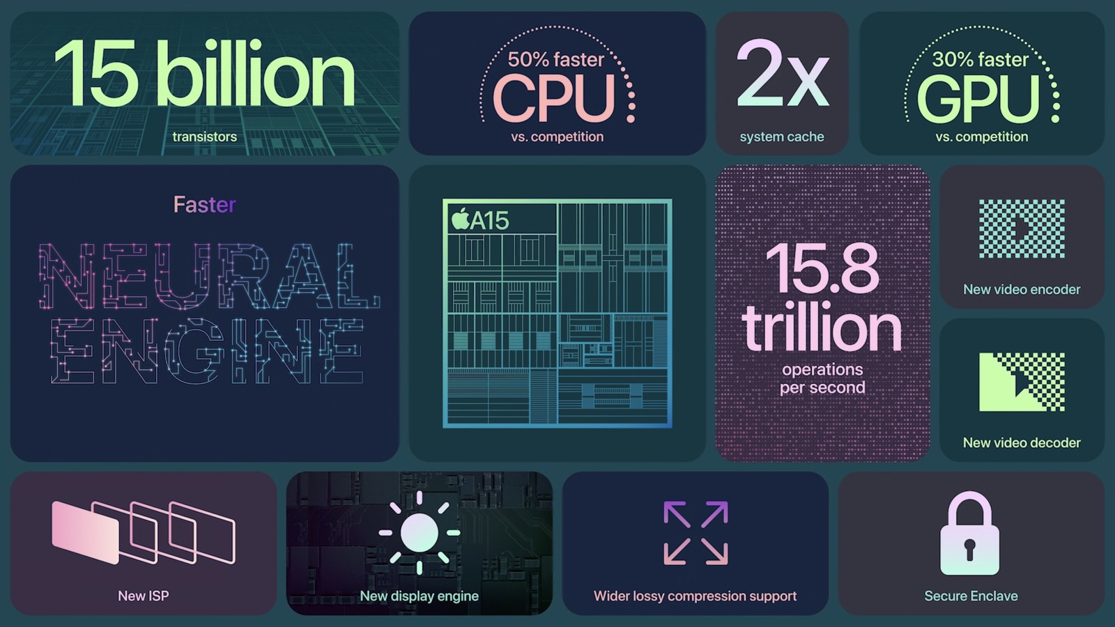 Tutte le novità software di iPhone 13 Pro non sarebbero possibili senza il nuovo, migliorato SoC (System on Chip) A15 Bionic, con la stessa configurazione esa-core dello scorso anno: 4 core ad elevata efficienza energetica e 2 core ad alte performance, coadiuvati per l’elaborazione degli algoritmi di machine learning e IA da un Neural Engine a 16 core.