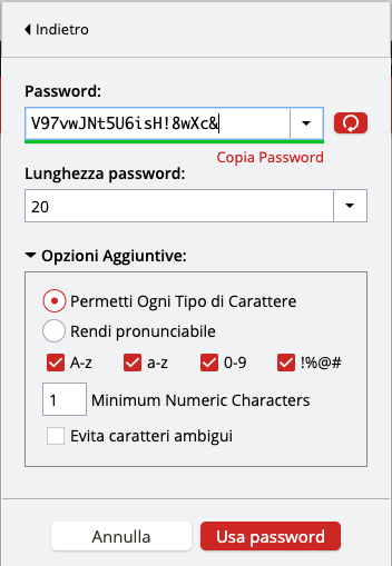 Nel caso dei siti web, LastPass permette di creare un mini documento in cui sono presenti l’URL del sito, il nome utente da utilizzare e la password. Se si sta registrando un account già esistente bisogna inserire la password che si è scelta ma, nel caso in cui si tratti di un nuovo account, è possibile far generare al gestore una password casuale di lunghezza variabile e contenente lettere minuscole e maiuscole, numeri e caratteri speciali.