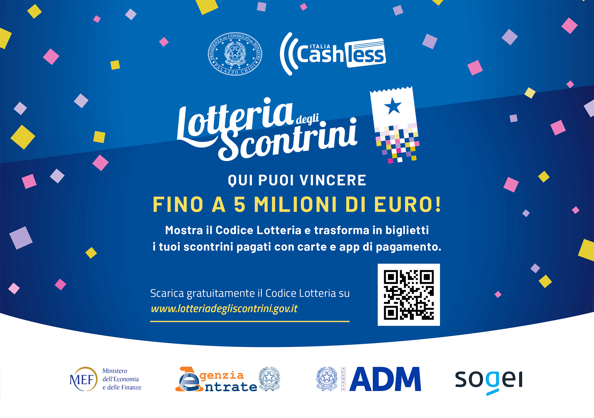 Importi, modalità di pagamento e codice lotteria relativi ai tuoi acquisti sono trattati telematicamente e convogliati nella banca dati del Sistema Lotteria dell’Agenzia delle Dogane, per essere utilizzati esclusivamente nelle estrazioni e per risalire al vincitore (tramite l’abbinamento codice lotteria – codice fiscale).