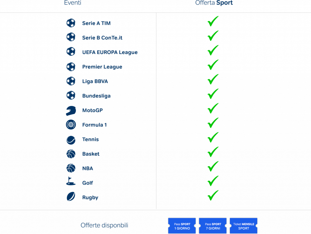 - Pass Sport: include le partite di Champions League (121 partite su 137), Europa League e Conference League, la Serie A TIM (3 partite su 10 a ogni turno), tutta la Serie BKT e la Serie C NOW, la Formula 1, la MotoGP e tanti altri sport (tennis, basket etc. etc.) al costo di 14,99 euro al mese (9,99 euro al mese per 12 mesi).