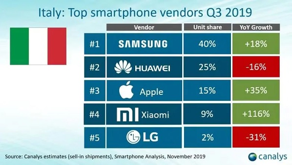Secondo uno studio di Canalys, Xiaomi è il quarto brand più venduto in Italia (dati riferiti al Q3 2019), appena sotto Apple che si piazza alla base del podio, dominato da Huawei in prima posizione e Huawei in seconda. Quello che stupisce però è l’enorme crescita anno dopo anno, spesso nell’ordine delle tre cifre: un risultato che non si vedeva in Italia dall’exploit di Huawei del 2015-2017.
