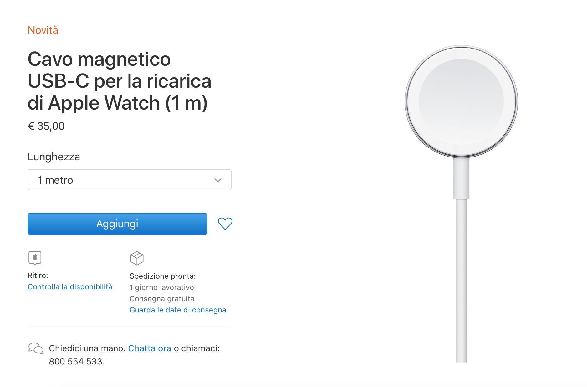 Per acquistare il cavo magnetico USB‑C sostitutivo per Apple Watch sono necessari 35 euro (negli USA 29 dollari) sia per la versione da 30 cm che per la versione da 1 metro. Se siete interessati, vi basterà cliccare su questo link per essere rimandati sulla pagina dedicata dell’Apple Store Online.