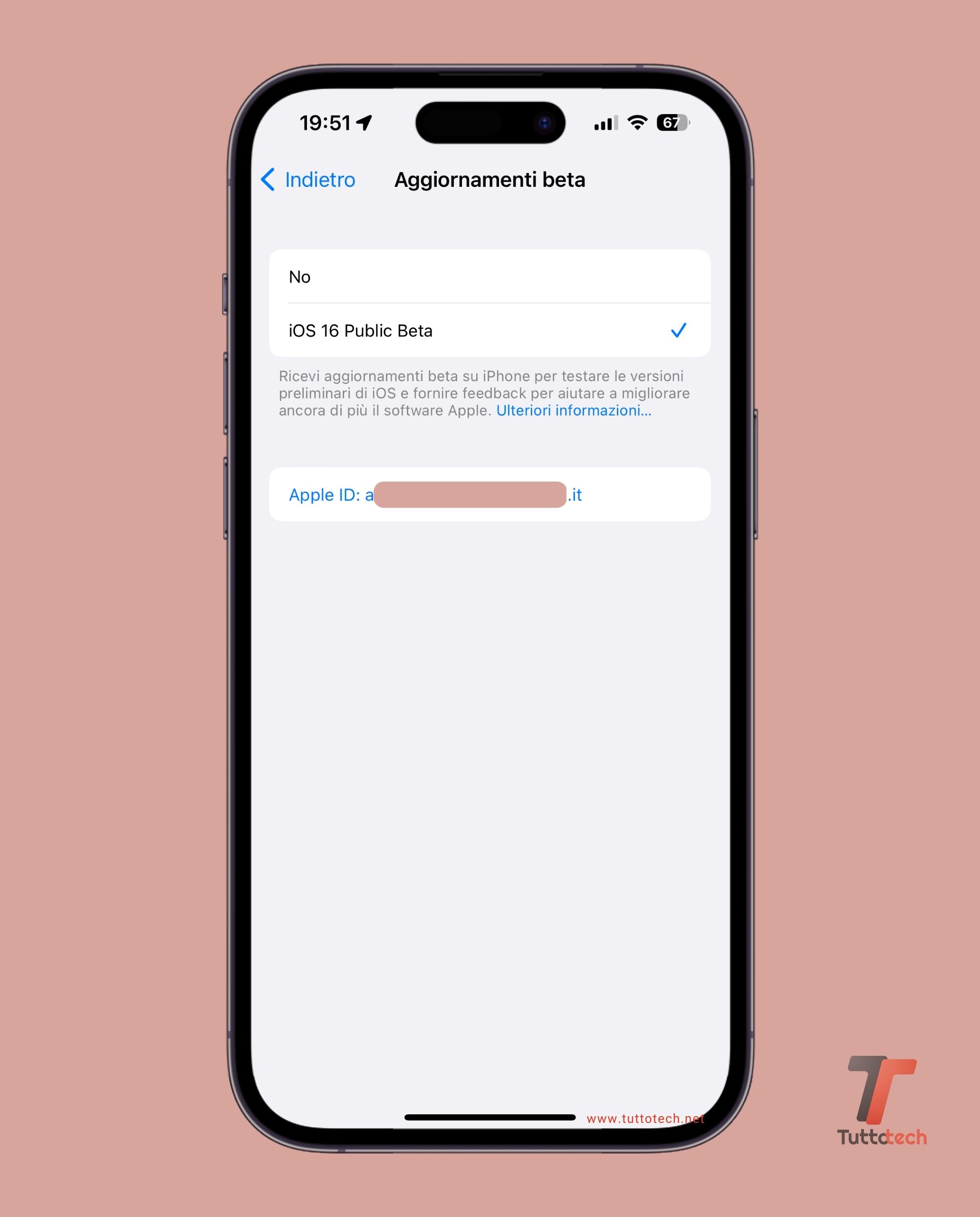 Subito sotto, è possibile impostare un ID Apple differente nel caso in cui quello con cui vi siate registrati al programma Apple Beta Software Program non fosse lo stesso con cui è configurato il vostro iPhone o iPad.