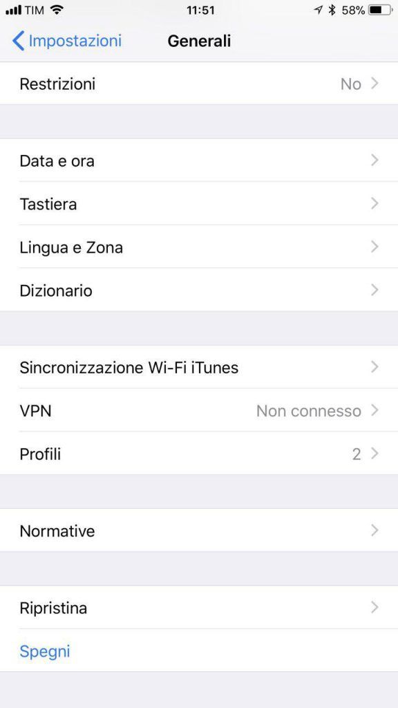 - l’ultima possibilità (se non ricordate le combinazioni) è lo spegnimento via software: potete recarvi in Impostazioni > Generali > Spegni, trovate quest’ultima voce scorrendo la pagina fino in fondo.