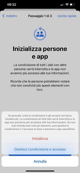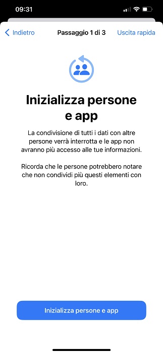 Nella schermata successiva pigiate sul tasto Inizializza persone e app, in modo da interrompere la condivisione di tutte le informazioni personali con altre persone e con le app. A questo proposito, Apple segnala che i contatti con cui in precedenza si erano condivisi i propri dati potranno notare che tali elementi non vengono più condivisi.
