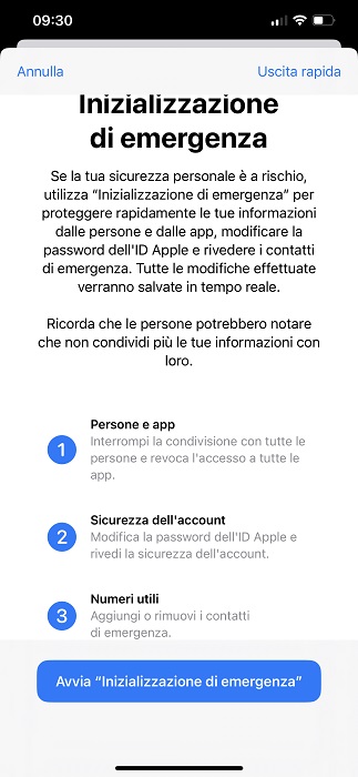 Passiamo ora invece all’opzione più estrema, cioè Inizializzazione di emergenza, attraverso cui è possibile ripristinare alle condizioni originarie la condivisione della posizione e delle proprie informazioni personali per tutti i contatti e le app.