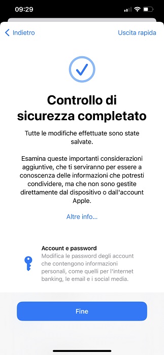 Come già spiegato qui sopra, i passaggi successi sono gli stessi di quelli già visti nel terzo step di Gestisci condivisione e accesso, in cui veniva richiesto di rivedere le impostazioni di sicurezza dell’account, tra cui appunto la password dell’ID Apple e il codice del dispositivo.