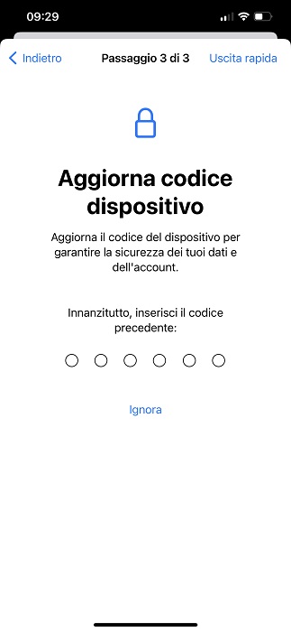 L’ultimo passaggio prevede l’aggiornamento del codice dispositivo. Anche in questo caso, se volete procedere con la modifica, non vi resta che digitare l’attuale codice e sostituirlo con uno nuovo.
