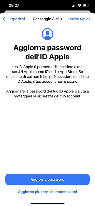 Nello step successivo vi verrà chiesto di modificare il vostro ID Apple. Per farlo, non dovete far altro che premere sul pulsante Aggiorna password e digitare la vostra nuova password per effettuare l’accesso all’account.