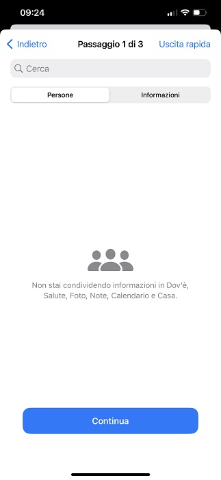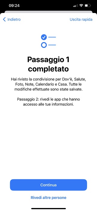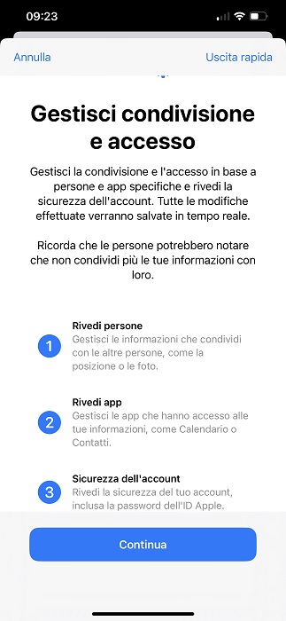 Nella schermata seguente troverete la lista delle persone con cui state condividendo la vostra posizione (Dov’è), i dati sulla salute (Salute), foto e video (Foto), appunti di qualsiasi tipo (Note), appuntamenti o eventi (Calendario) e le informazioni sul sistema di domotica della vostra abitazione (Casa). Da questa schermata potete negare l’autorizzazione a una o più persone in riferimento alle informazioni che ritenete più sensibili. Se invece non vi sono persone, significa che non avete condiviso con altri alcun vostro dato con altri contatti. Per proseguire, premete sul pulsante Continua.