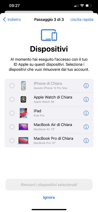 Il terzo passaggio consiste nel rivedere le impostazioni di sicurezza del vostro account. Dapprima vi verranno mostrati i dispositivi che hanno effettuato l’accesso con il vostro ID Apple. Se ci sono dei device indesiderati o che non riconosci, fai tap accanto a ognuno di loro e premi sul pulsante Rimuovi i dispositivi selezionati per uscire in automatico dal vostro account in questi dispositivi.