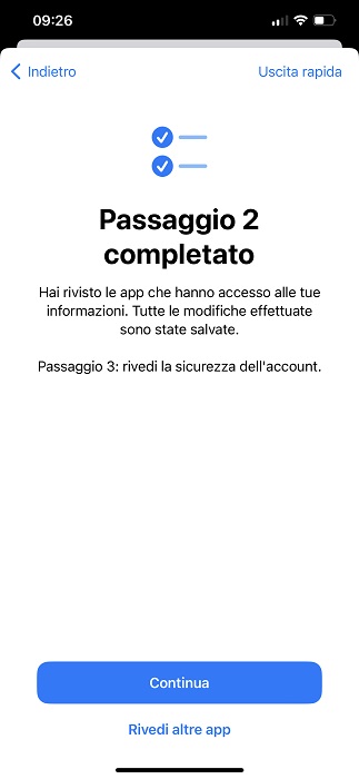 Il secondo passaggio consiste nel rivedere le applicazioni che hanno accesso alle vostre informazioni personali. Premere sul tasto Continua per proseguire.