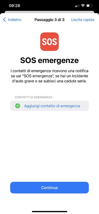 Allo stesso modo, vi verrà chiesto di aggiornare o aggiungere un contatto di emergenza per far sì che ricevano una notifica nel caso subiate una caduta o un incidente grave. Per aggiungere un contatto è sufficiente premere sul pulsante Aggiungi contatto di emergenza. Al termine, premete sul pulsante Continua per proseguire.