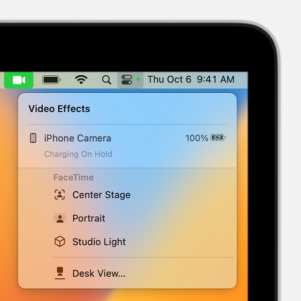 Ora che il Mac è in grado di usare la fotocamera dell’iPhone come webcam, puoi finalmente usare gli effetti video. Per farlo, fai clic sull’icona del Centro di Controllo del Mac posizionata in alto a destra dello schermo accanto alla data e all’orario, quindi premi sulla scheda Effetti Video nell’angolo in alto a sinistra per attivarli, dopodiché seleziona una delle quattro opzioni disponibili tra Inquadratura automatica, Luce set fotografico, Modalità Ritratto, Panoramica scrivania.