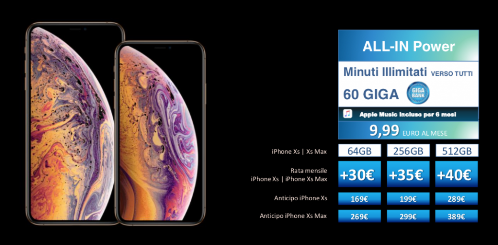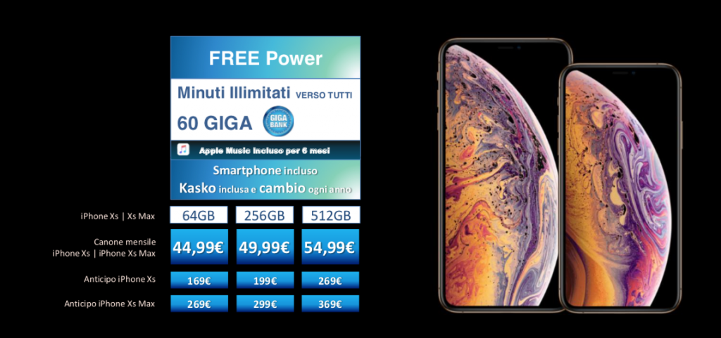 - iPhone Xs 512GB, 30 rate mensili da 40€ più un’anticipo da 289€ + 9,99 euro per la promo