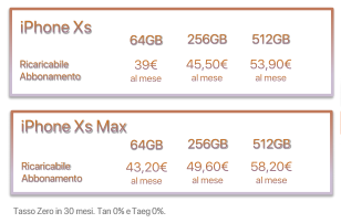 - iPhone Xs Max 512GB, 30 rate mensili da 54,99€ più un’anticipo da 389€.