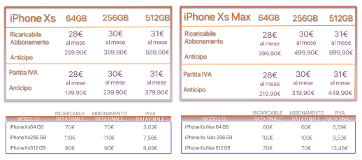 - iPhone Xs Max 512GB, 30 rate mensili da 31€ più un’anticipo da 699,90€.