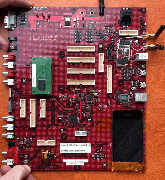 Questi sviluppatori non conoscevano la forma finale dell’iPhone, e talvolta queste schede sono state fornite anche senza lo schermo che vedete nella GIF qui accanto. Apple ha usato solo circuiti stampati rossi per il suo prototipo di hardware dell’iPhone, favorendo però il blu, il verde e altri colori per le unità di produzione.