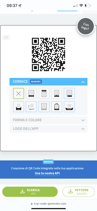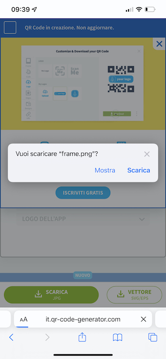 - Nella nuova schermata che si apre scegli il formato che desideri assegnare al QR Code, per poi pigiare su Scarica due volte consecutive per effettuare il download del codice in formato JPG.