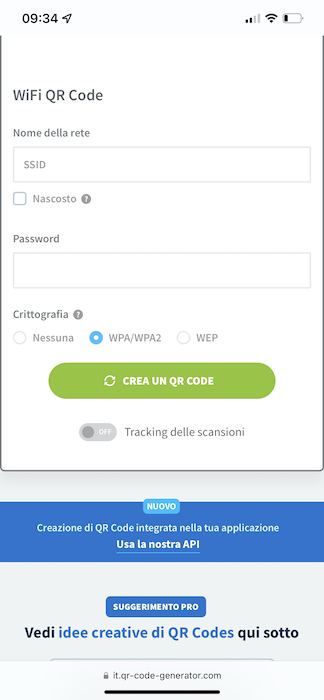 La prima soluzione per condividere la password Wi-Fi da iPhone ad Android prevede l’uso di un QR Code. Per generarne uno puoi fare riferimento a un sito web o a un’app: se usi di frequente i codici QR, ti suggeriamo di preferire l’app; nel caso invece sia un’operazione saltuaria, allora dai la precedenza a un sito. Noi abbiamo impiegato per esempio il portale qr-code-generator.com.