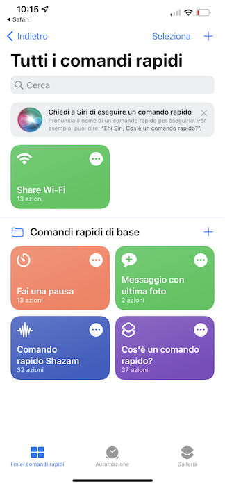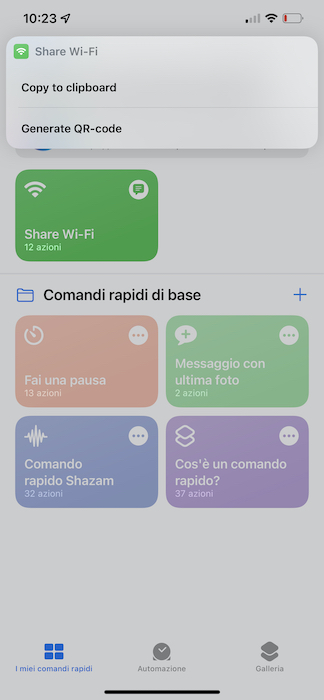 - Ora vai sul menu I miei comandi rapidi e tocca l’icona dei tre puntini del riquadro Share Wi-Fi.