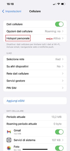 Puoi verificare che la configurazione sia andata a buon fine tramite la scheda Cellulare: se accanto alla voce Hotspot personale leggi Attivo significa che sei pronto per usare tale funzione e trasformare così il tuo iPhone in un modem per condividere la connessione con i dati mobili della tua offerta Internet.