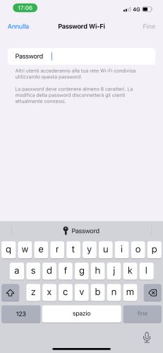 Nota: la nuova password deve contenere obbligatoriamente almeno 8 caratteri. Una volta che esegui la modifica della password, gli altri utenti collegati all’hotspot dell’iPhone verranno disconnessi in automatico.
