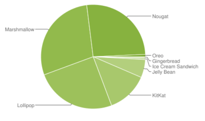 Android Oreo è stato rilasciato la scorsa estate e ha ancora solo una base di installazioni dello 0,7%. In totale, le ultime tre versioni risalenti al 2015 rappresentano solo il 56% dei dispositivi Android.