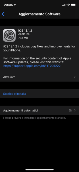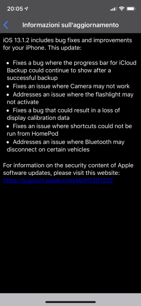 Per quanto riguarda iOS 13.1.2 e iPadOS 13.1.2, come potete vedere dagli screenshot vanno a sistemare alcuni bug relativi ad iCloud (la barra di caricamento continuava ad aumentare anche dopo che l’operazione era conclusa), alla fotocamera e al flash che a volte non funzionavano, alla calibrazione cromatica del display e alla connessione Bluetooth con alcuni veicoli.