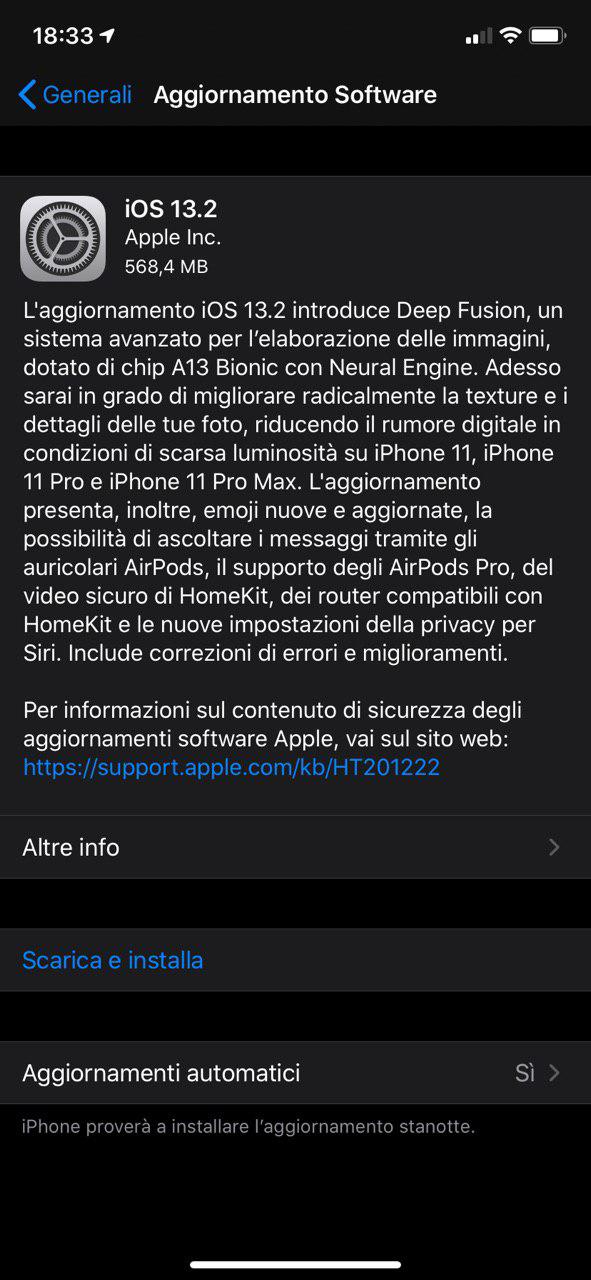 Per procedere al download di iOS 13.2, è necessario controllare la sua disponibilità: basta andare in Impostazioni > Generali > Aggiornamento Software. Chiaramente la sua compatibilità è data con tutti gli iPhone e gli iPod Touch che sono compatibili con iOS 13 (per gli iPad ormai c’è iPadOS).