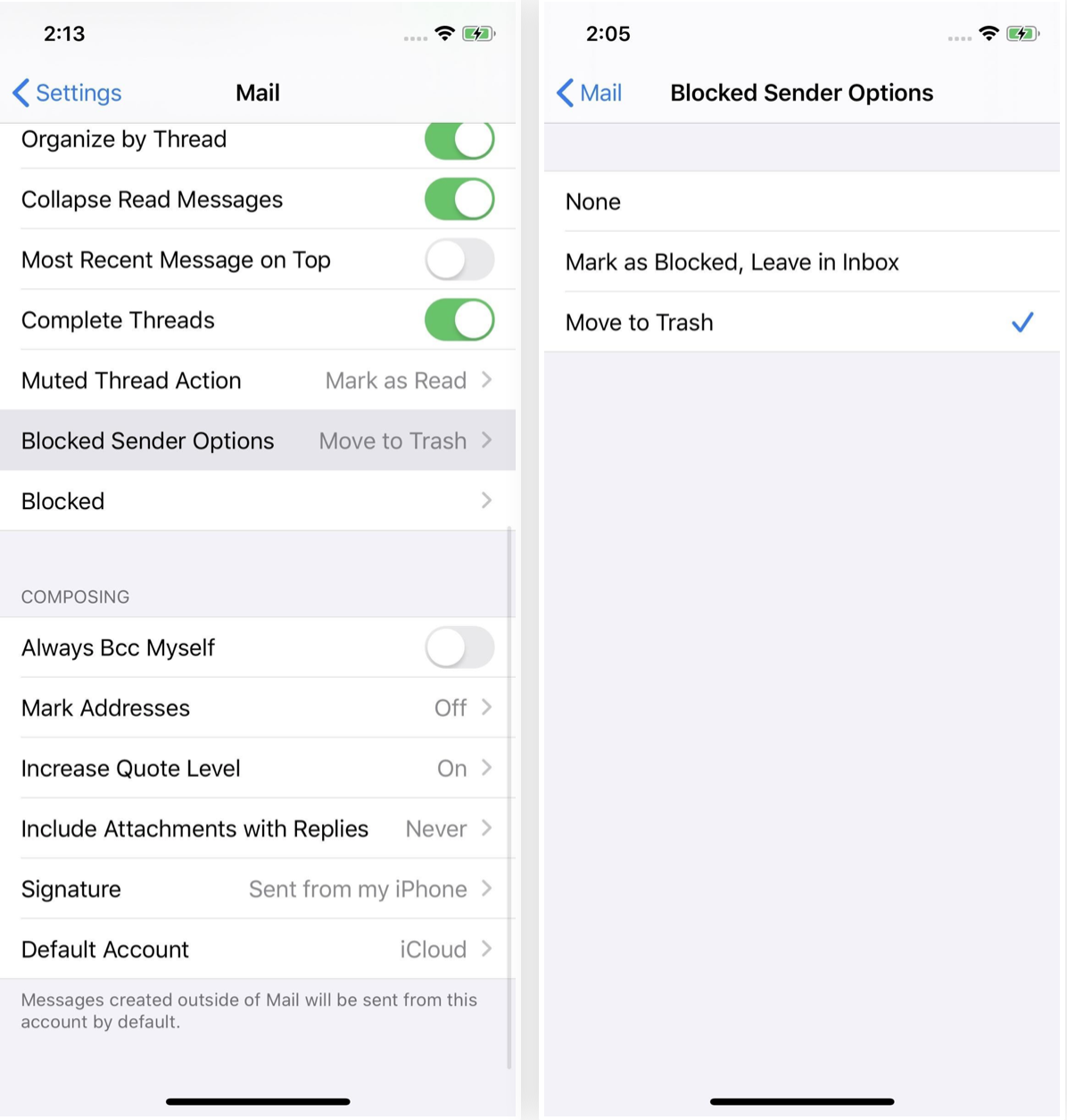 - Nuove opzioni per i messaggi ricevuti da contatti bloccati in Mail: nelle impostazione dell’app Mail, è disponibile una nuova opzione legata ai contatti bloccati che permette, alla ricezione di un messaggio, di spostarlo direttamente nel cestino oppure lasciarlo nella Posta in Arrivo (senza essere notificato);