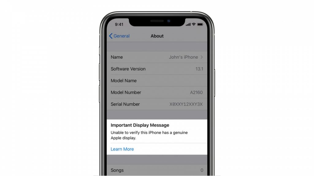 - Scorrere verso il basso e fino a trovare la voce “Impossibile verificare che questo iPhone abbia un display Apple originale” insieme all’opzione per toccare per saperne di più.