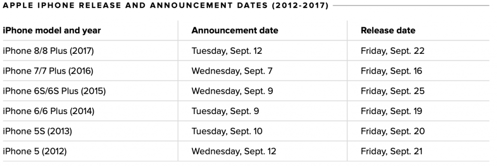 Stando a quanto analizzato da CNET, Apple presenta solitamente i nuovi smartphone di martedì o di mercoledì, e quasi mai più tardi della seconda settimana di settembre. La tabella che vi mostriamo qui di seguito mostra le date di presentazione dei nuovi iPhone degli ultimi 6 anni e, in ogni occasione, i calcoli hanno tenuto conto del Labor Day, che negli Stati Uniti cade il primo lunedì di settembre.